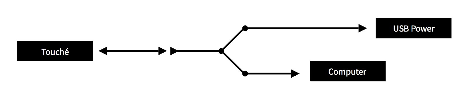 The Ground Loop Adapter possesses three ends : Two male USB connectors, one female USB connector. Plug the longest segment of the two male connectors to an electrical outlet and the shortest segment to your computer, then plug the female connector to Touché’s standard coat USB Cable.